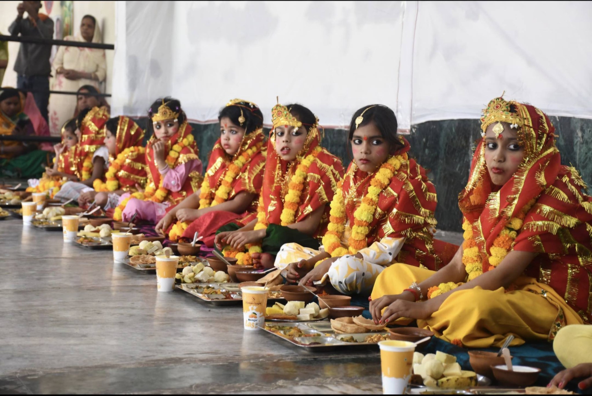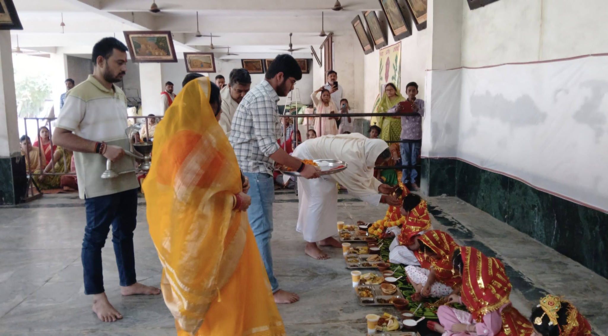 नवरात्र पूजन के आचार्य (पुजारी) श्री प्रकाश जी व आश्रम की वरिष्ठ सदस्या श्रीमती संगीता सिंह की अगुवाई में श्रद्धालुजनों द्वारा देवी स्वरुप में विराजमान सभी 9 बाल कन्याओं और भैरव रूप में बालक के पाँव पखारे गए । तत्पश्चात सभी देवी व् भैरव जी की विधि सम्मत पूजा कर उनकी आरती उतारी गयी । इसके बाद सभी देवियों व भैरव जी को विभिन्न पकवानों का भोग लगाया गया और उन्हें तृप्त कराकर पैर छूकर उनका आशीर्वाद लिया गया ।